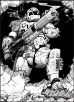 Armor does more than just present the reader with more armor options, it also describes some of their purposes from a fluff and setting stand-point. The actual list of armor is quite vast and includes a wide variance between characteristics, cost and options. Each piece is also further described with a scattering of illustrations. The armor is also grouped into one of 8 categories: body armor, heavy armor, mechanized battle armor, reactive armor, specialized armor, bargain basement armor, regeneration armor, and armor packages. Further armor lists include helmets, resonance helmets, a large listing of armor options, and weapons that attach to the armor like arm rockets and radar packages.