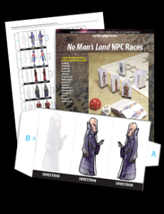 Both paper miniatures publications contain mail and female versions of the core races and those found within the No Man’s Land campaign setting. The miniatures are designed in a triangle format where you get a right and left side, full-color view of the character and a rear washed out version of the character. This format does not require a base and the miniatures should stand well on the tabletop.