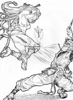Combat in Wu Xing: The Ninja Crusade is quite different than most role-playing games. I’m going to use the term integrated turn sequence (which creates very interactive combat). Each round of combat is divided into 20 counts. Every action (combat, wushu, etc…) and reaction has a speed which corresponds to a number of counts required to perform. While there is a basic initiative, characters only perform one action and cannot finish again until the action/reaction completes. During the time the action is being performed, the opponent declares their action and the two basically occur at the same time. If character 1 performed an action that took a long time (such as speed 8) and the opponent performed a short action, then character 2 may have the chance to commit their next action before character 1. This means all characters involved are acting sequentially depending on how long their actions/reactions take to perform. This is in complete opposition to systems where character 1 performs all their actions and then character 2 performs all theirs and so on and so forth. Wu Xing: The Ninja Crusade has all characters exchanging actions throughout the round.