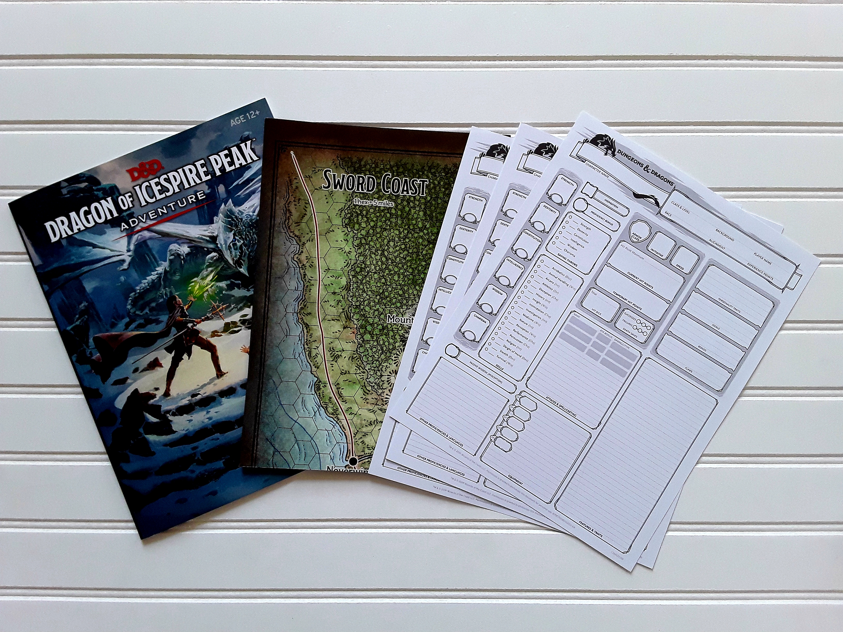 Next up are the accessories – DM’s screen (an abridged, low-cost version that serves as more of a quick reference), dice (very simple, but completely usable), cards to make things a little fun, the Sword Coast map, and character sheets. Just the right amount you need to get a new player involved.